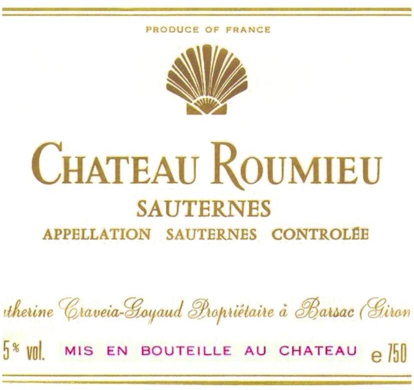 商标名称:CHATEAU ROUMIEU SAUTERNES APPELLATION SAUTERNES CONTROLEE PRODUCE OF FRANCE RTHERINE CRAVEIA-GOYAUD PROPRIETAIRE A BARSAC GIRON 5% VOL. MIS EN BOUTEILLE AU CHATEAU E 750
