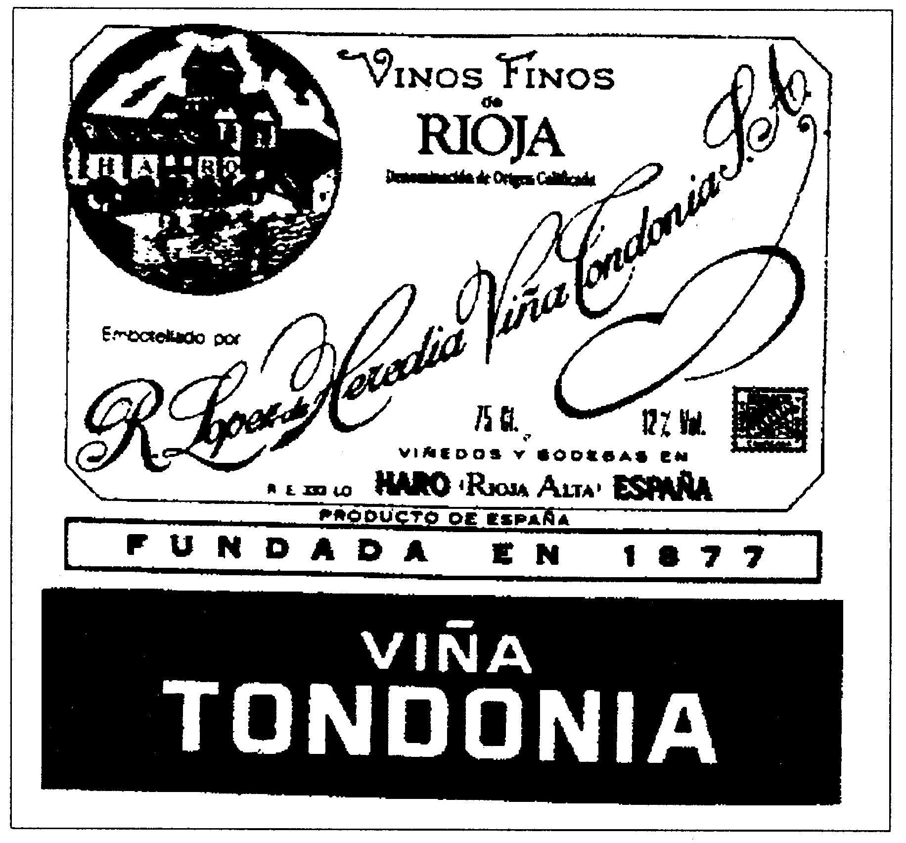 商标名称:VINOS FINOS RIOJA R.LOPEZ DE HEREDIA VINA TONDONIAS.A. VINA TONDONIA FUNDADA EN 1877 ?